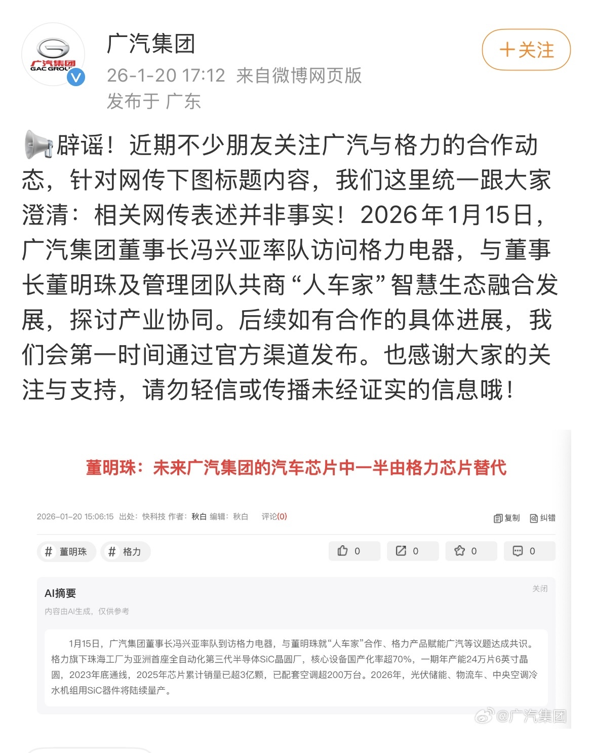 1月20日,广汽集团发布声明,否认“未来广汽的汽车芯片中一半由格力产品替代”的网传说法,指出“相关表述并非事实”。