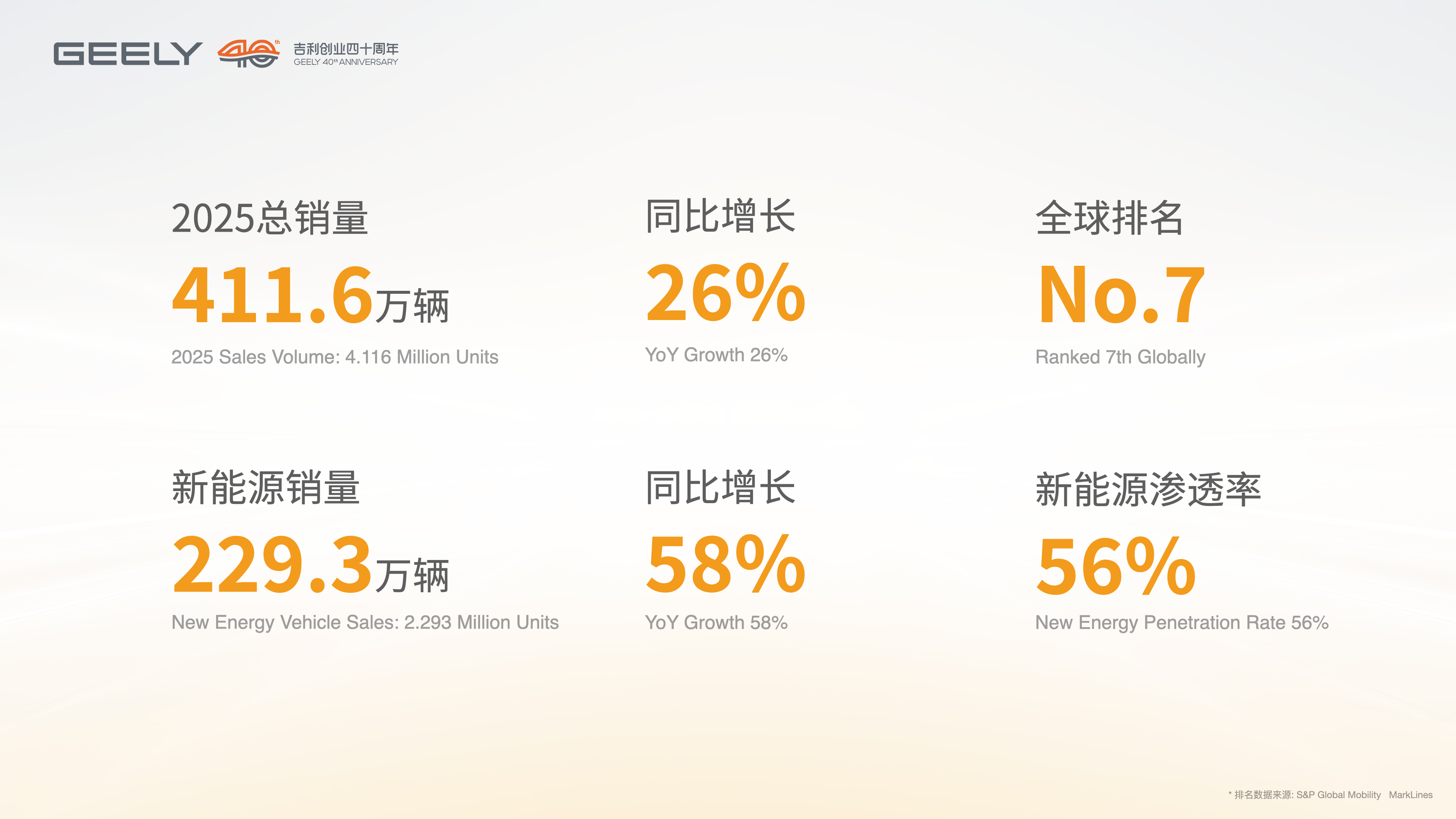 数据显示,2025年,在全球汽车产业电动化与智能化的深度变革中,吉利控股全年总销量达411.6万辆,同比增长26%,连续五年实现快速增长。其中,新能源汽车销量达229.3万辆,同比增长58%,新能源渗透率达56%。吉利控股销量首次突破400万辆,排名全球第七,成为前十汽车集团中增速最快的企业。